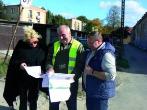 Ryszard Ziółkowski, Tomasz Paradowski i Beata Kowalska rozmawiają o szczegółach remontu ulicy