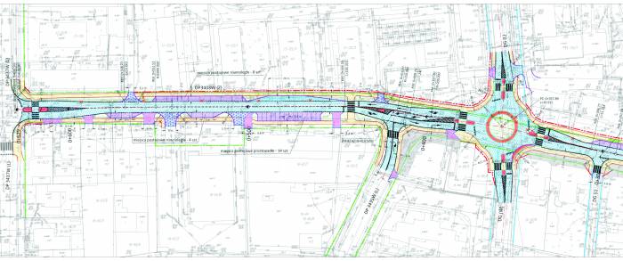 – budowę ronda na skrzyżowaniu z ulicami 17 Sierpnia i Górną o średnicy zewnętrznej 30,00 m i szerokości jezdni 6,00 m; – rozbudowę skrzyżowania z ulicą Kolejową,