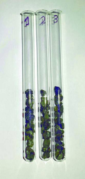 – każda z trzech odrębnych, zważonych próbek poddana wygrzewaniu w temperaturze ok. 600-800°C ulegała częściowemu stopieniu, co dawało możliwość oddzielenia stałych okruchów mineralnych od stopionej, smolistej fazy organicznej i ponownego zważenia części mineralnej;