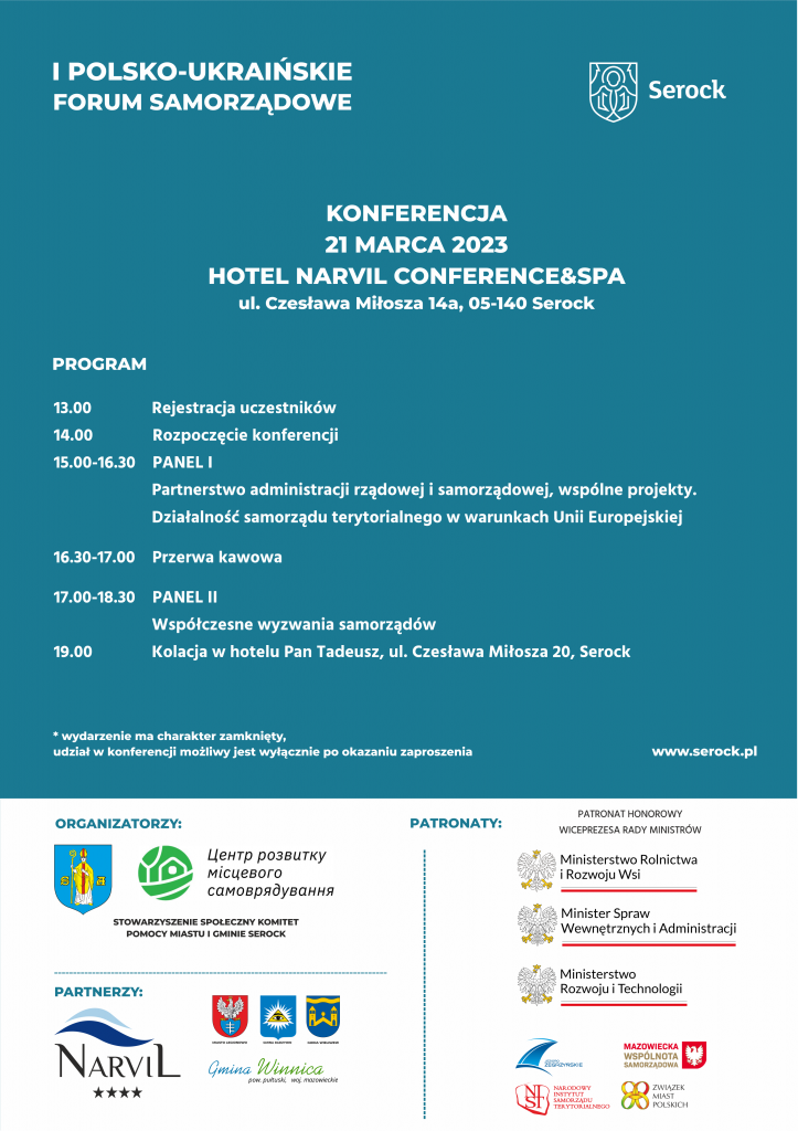 W ramach przedsięwzięcia 21 marca 2023 r. w Hotelu Narvil Conference&Spa w Serocku będzie miała miejsce konferencja, podczas której uczestnicy dyskutować będą m.in. o partnerstwie administracji rządowej i samorządowej, działalności samorządu terytorialnego w warunkach Unii Europejskiej oraz o współczesnych wyzwaniach samorządów.