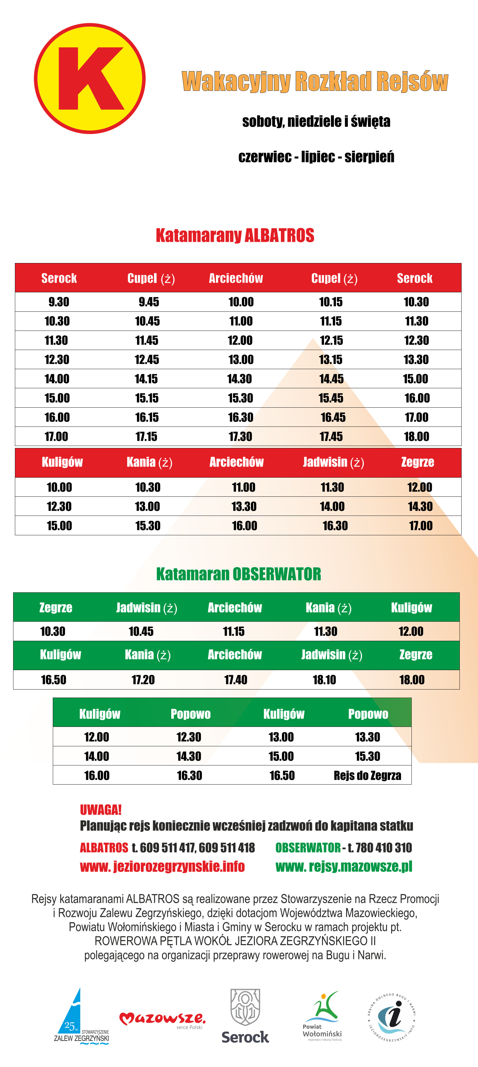 Malownicze tereny Jeziora Zegrzyńskiego zachęcają do podróżowania rowerem. Opisane przez nas szlaki stanowią jedynie propozycję tras. Podróżników pragnących poznać inne, niezbadane jeszcze zakątki naszej pięknej gminy, zachęcamy do przeprawy przez rzekę w ramach specjalnych rejsów sezonowych. Katamarany mogą pomieścić do 12 osób i 8 rowerów. Przystanki, z których można udać się w rejs znajdują się w miejscowościach Cupel, Arciechów oraz w Serocku.