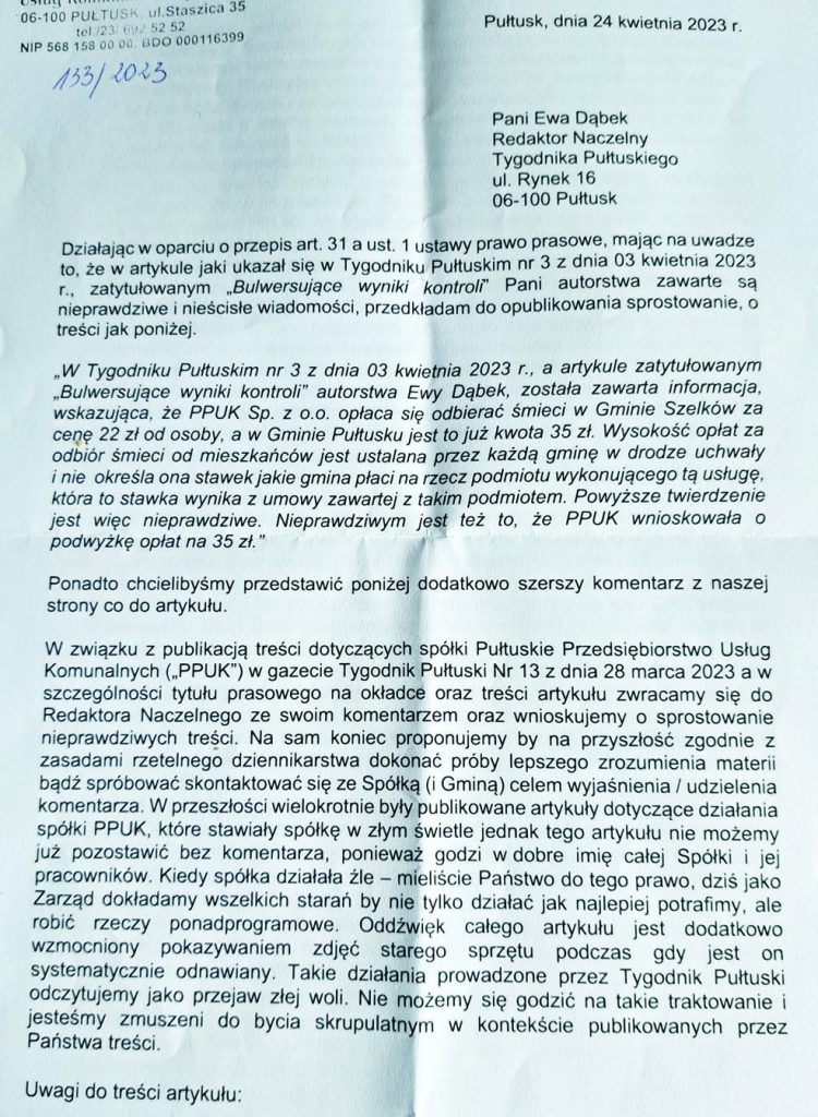W formie papierowej otrzymaliśmy to obszerne pismo pocztą tradycyjną. Mimo próśb kierowanych do prezesa zarządu Kamila Szczepańskiego, który pod sprostowaniem się podpisał, by przesłał nam jego treść w formie elektronicznej, niestety nie dotarło na wskazany adres e mail do momentu gdy zamykaliśmy ten numer Tygodnika.