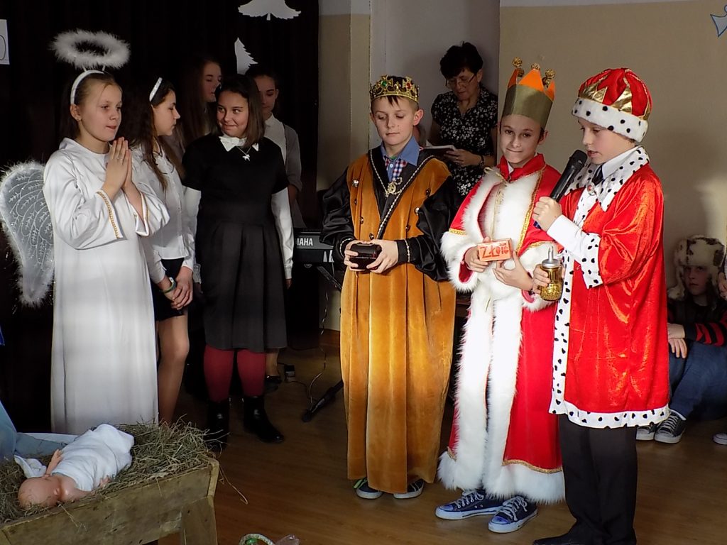 W tym dniu społeczność szkolna oraz zaproszeni goście wspólnie uczestniczyli również w jasełkach przygotowanych przez uczniów klas IV-VI pod kierunkiem p. Hanny Niedbały i p. Marty Myszor. Wśród zaproszonych gości byli: ks. Janusz Zdunkiewicz i ks. Stanisław Nowak, Kierownik Wydziału Edukacji, Kultury i Sportu- p. Piotr Karkowski, Przewodniczący Rady Rodziców-p. Ryszard Myszor, nauczyciele emeryci i rodzice uczniów.