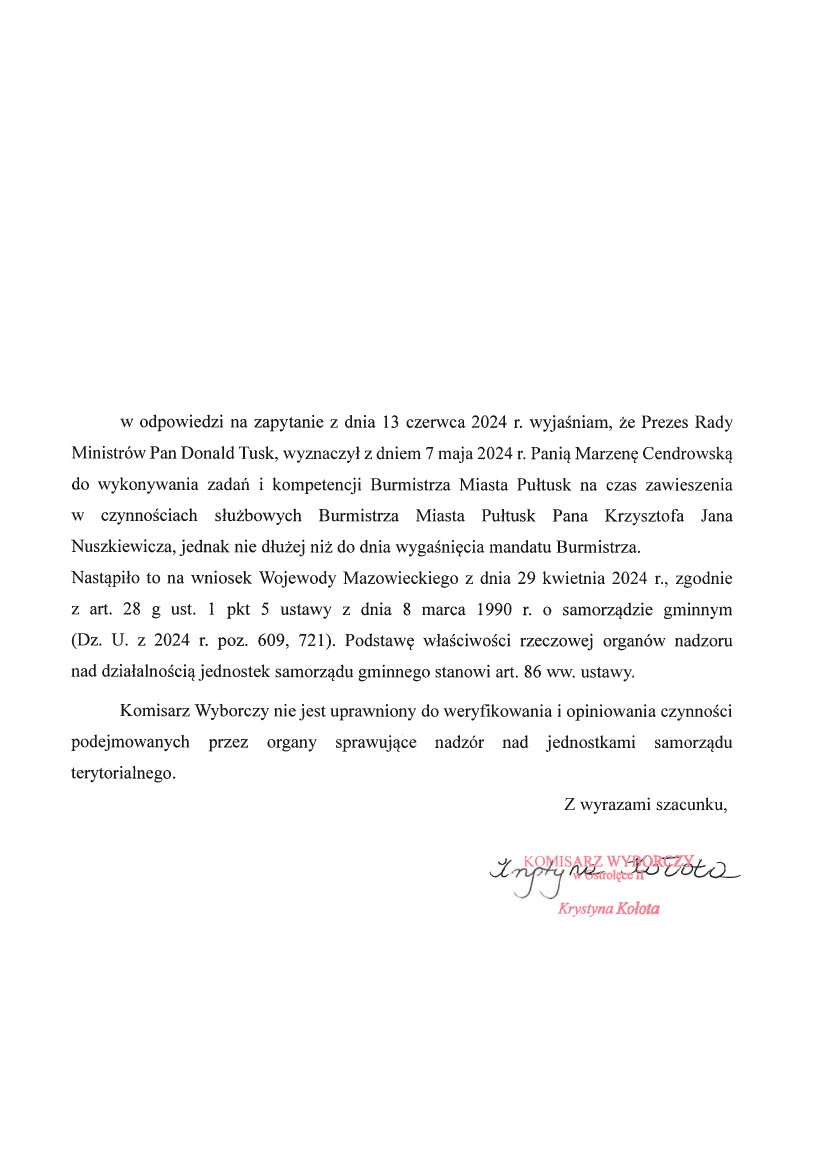 “W związku z przygotowywaną publikacją proszę o wyjaśnienie od strony formalnej prawidłowości zawieszenia w pełnieniu funkcji burmistrza Pułtuska wybranego w demokratycznych wyborach pana Krzysztofa Nuszkiewicza (…).
