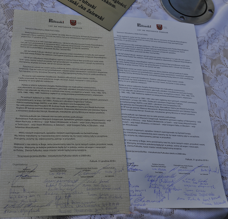 Co mieści metalowy pojemnik w kształcie tuby? Pamiątkowe wydanie TYGODNIKA PUŁTUSKIEGO, zawierające prezentacje ważnych firm i instytucji z miasta i powiatu, przesłanie, czyli List do Przyszłych Pokoleń, podpisany przez organizatorów akcji: Pawła Kozerę – wydawcę “TP”, Ewę Dąbek – redaktor naczelną, przewodniczącego RP Tadeusza Nalewajka i starostę Jana Zalewskiego (kopię listu przekażemy do Muzeum Regionalnego). W kapsule znalazły się również przedmioty podarowane przez organizatorów, burmistrza Wojciech Gregorczyka, prezesa powiatowych struktur PSL Witolda Chrzanowskiego i innych. Jako ciekawostkę podajmy, że pojemnik mieści także kartę pamięci ze zdjęciami uczestników projektu.