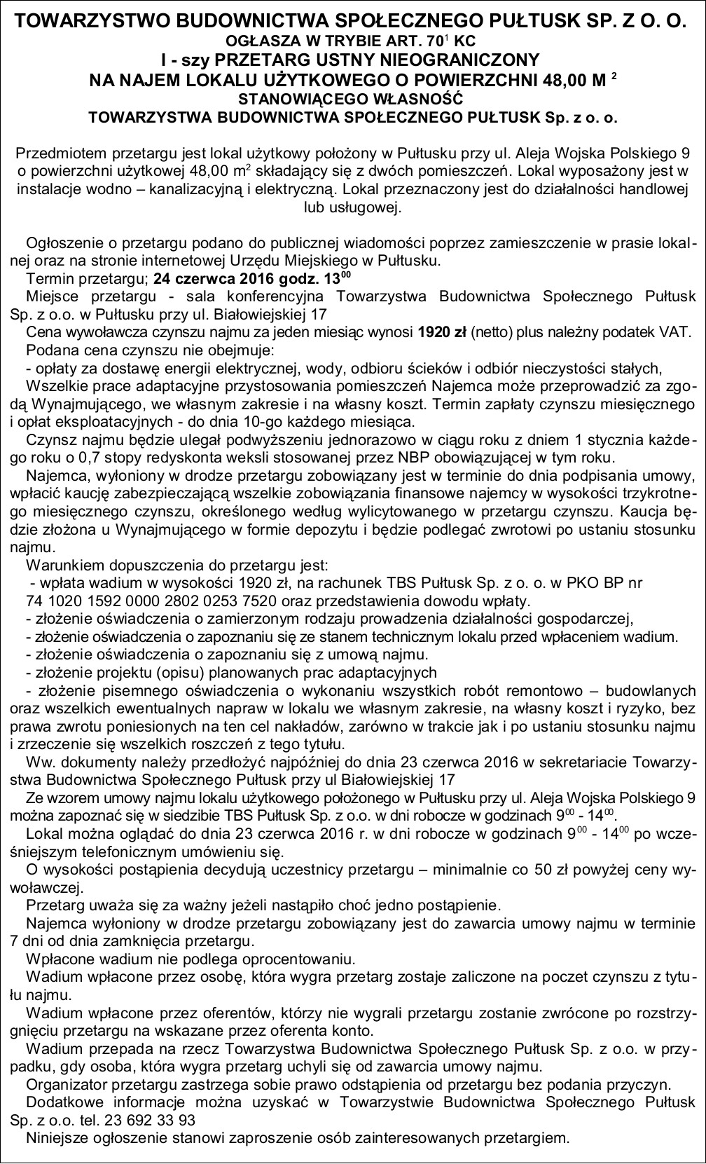 TBS Pułtusk sp. z o. o. przetarg na najem lokalu przy alei Wojska Polskiego 9 2016-06-14 10:09:00 Komentarze