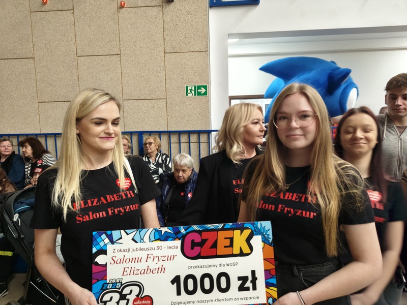 A przed nami już panie z salonu fryzjerskiego ELIZABETH, które przyszły do sztabu z czekiem na 1000 złotych. Elżbieta Olbrych, właścicielka salonu: – Ofiarujemy dziś na ORKIESTRĘ z okazji 33. FINAŁU 1000 złotych, dziękując jednocześnie naszym klientkom za datki.