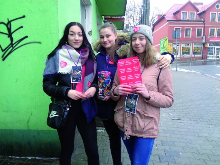 Martyna Gołębiewska, Anna Sztolc, Patrycja Zadrożna – uczennice ZS im. B. Prusa, dziewczęta zaprawione w zbieraniu pieniędzy; tylko jedna z nich gra w ORKIESTRZE po raz pierwszy: – Lubimy pomagać, dlatego bierzemy udział w akcji. Trochę jesteśmy niezadowolone z powodu niehandlowej niedzieli. Jest po prostu mało ludzi na ulicach, no i więcej jest wolontariuszy… Jak na razie nie spotkałyśmy się z żadnymi negatywnymi uwagami. Jest dobrze i oby było tak dalej. Mamy nadzieję na dużą kwotę, będziemy zbierać pieniądze do 20, a potem będzie wyjazd zorganizowany przez naszą szkołę do Warszawy, do studia, do Jurka Owsiaka.
