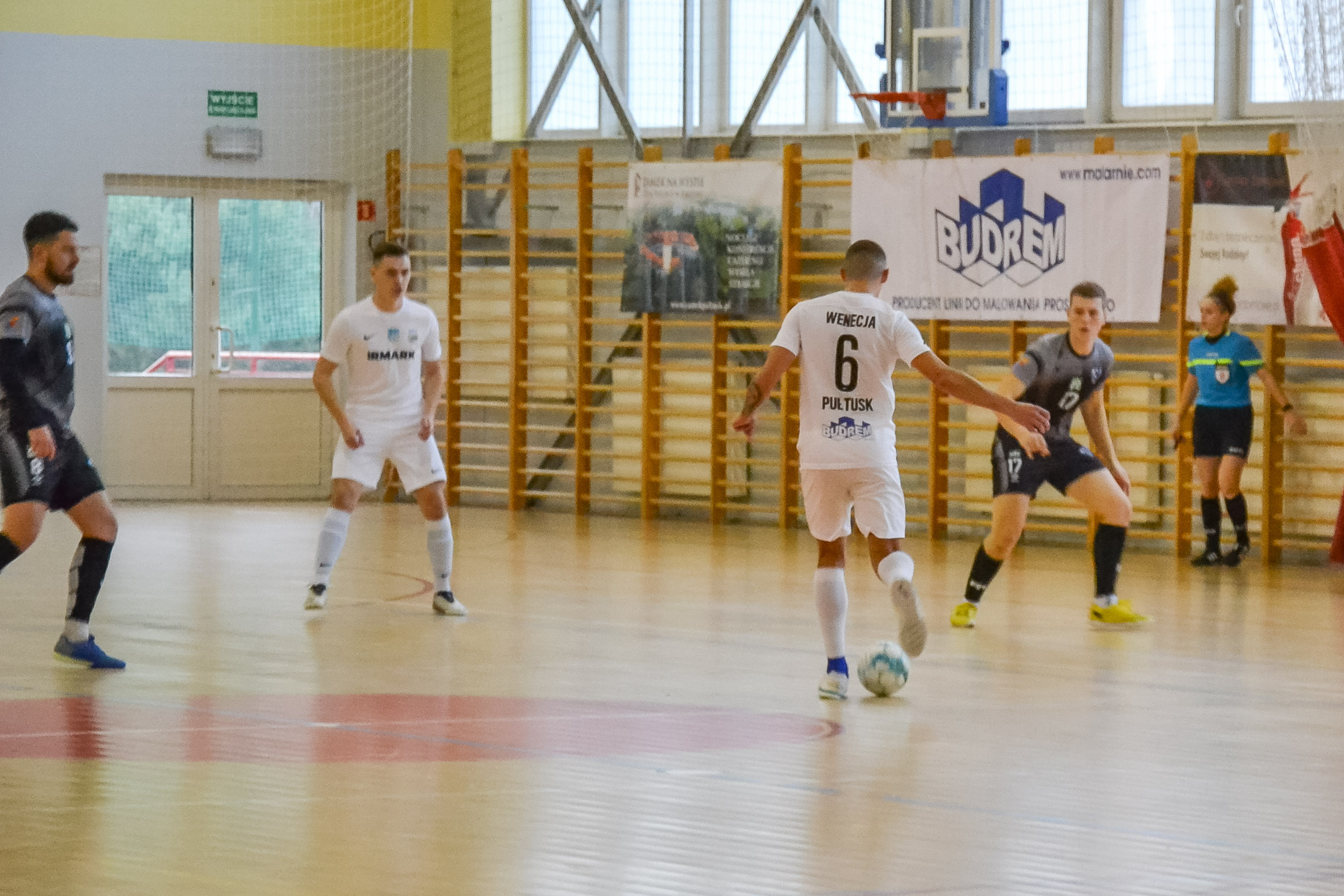Podbudowana dwoma zwycięstwami z rzędu, Wenecja przystąpiła do tego spotkania bardzo mocno zmotywowana i już w 1 minucie kapitan drużyny Maciej Frąckiewicz wpisał się na listę strzelców. Na hali zapanowała euforia. Kolejne minuty gry w pierwszej połowie były całkowicie zdominowane przez miejscową drużynę, co skutkowało kolejnymi sytuacjami pod bramką zawodników AZS.W kolejnych minutach brakowało jednak trochę szczęścia. Pułtuszczanie kilkukrotnie trafiali w słupek, wieloma świetnymi interwencjami popisał się bramkarz rywali, a czasami zawodnikom Wenecji zwyczajnie brakowało spokoju pod bramką rywala. Ta pechowa passa nie trwała jednak długo. Przed zakończeniem pierwszej połowy świetnie rozegraną akcję zakończył powracający po kontuzji Piotr Cygan i na tablicy wyników po pierwszej połowie widniał wynik 2-0.