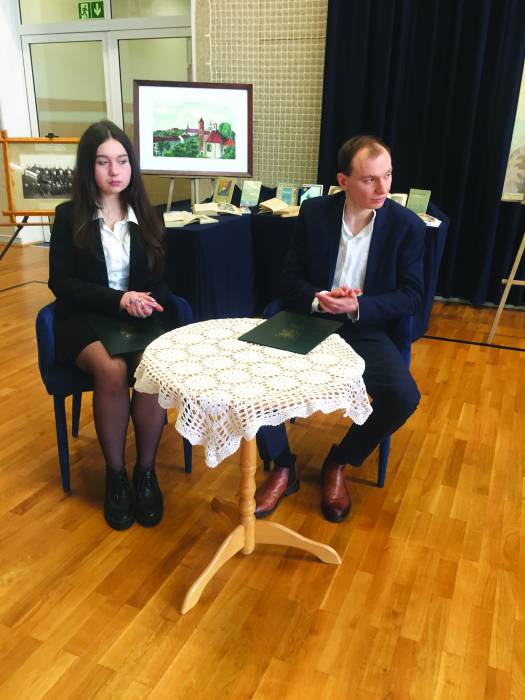 – Historyczne szkolne mury, sale – te same, choć nie te same – zapewne dobrze pamiętają Wiktora Gomulickiego, chłopca, który spędził tu młodzieńcze lata i tak pięknie opisywał je we “Wspomnieniach niebieskiego mundurka” – tymi słowami dyrektor Anna Majewska, wraz z dyr. LELEWELA Bożeną Potyraj (organizatorki spotkania), powitała uczestników konkursu oraz publiczność. – Spotykamy się dziś w naszym liceum, by lepiej poznać Wiktora Gomulickiego, jednego z jego wybitnych uczniów, który na kartach swoich utworów utrwalił szkołę i miasto. – Miasto, w którym kształtowała się jego wrażliwość, poczucie piękna, talent. Tu, w mieście nad Narwią, spędził znaczną część swojego dzieciństwa, młodość, ukończył pułtuskie gimnazjum; wszystko odczuwał, wszystkim się zachwycał – dodała B. Potyraj i zaprosiła do obejrzenia prezentacji o Wiktorze Gomulickim zatytułowanej “Wpisany w historię Pułtuska”, autorstwa Aldony Nalewajk, zastępczyni dyr. PBP.