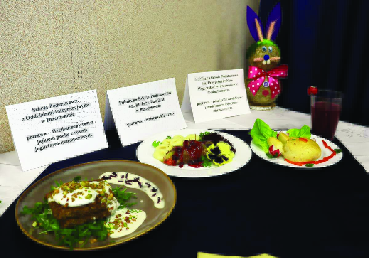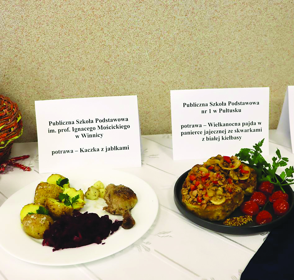 Oceniający nie mieli łatwego zadania, bo młodzi kucharze bardzo ambitnie podeszli do swoich zadań. Drużyna ze Społecznej Szkoły Podstawowej w Gzach przygotowała ptysie z pastą jajeczną i łososiem, uczniowie z Nowego Niestępowa tartę z farszem jajecznym musem z łososia i sosem żurawinowym. Kolejny zespół, ze Szkoły Podstawowej w Strzegocinie, serwował zielone naleśniki pod chmurką, a ten ze szkoły w Gołyminie–Ośrodku pasztet wielkanocny z jajek. Następne dania to kaczka z jabłkami – Szkoła Podstawowa w Winnicy, wielkanocna pajda w panierce jajecznej ze skwarkami z białej kiełbasy – Szkoła Podstawowa nr 1 w Pułtusku, wielkanocny tost z jajkiem poche z sosem jogurtowo – majonezowym – Szkoła Podstawowa w Dzierżeninie, szlacheckie zrazy – Szkoła Podstawowa w Płocochowie, paszteciki drożdżowe z nadzieniem jajeczno – chrzanowym – Szkoła Podstawowa w Przewodowie Poduchownym.