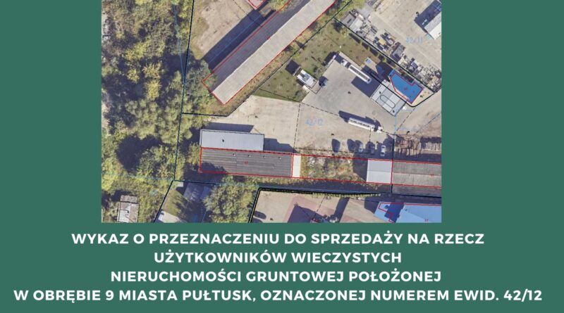 Burmistrz Miasta Pułtusk informuje, że przeznaczona została do sprzedaży na rzecz użytkowników wieczystych nieruchomość gruntowa stanowiąca własność Gminy Pułtusk, położona w obrębie 9 miasta Pułtusk, oznaczona numerem  ewidencyjnym: