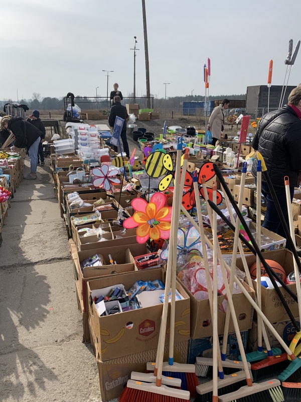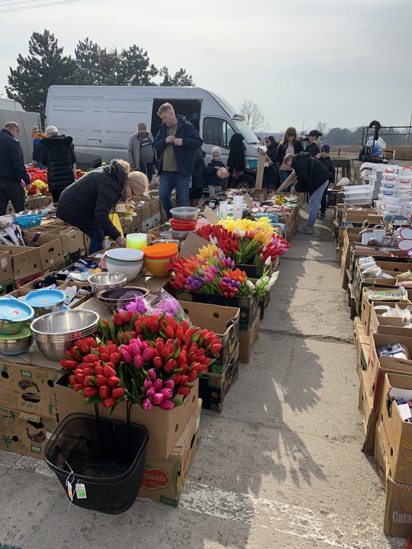 Świeżutkie kwiatki robią konkurencję sztucznemu kwieciu, którego barwne plamy widać z daleka. Przy plastikowych tulipanach (czy sensownie?) rozłożono narzędzia ogrodnicze, wiadomo, przydatne nawet tak niewyrobionej ogrodniczce jak ja. Niedaleko artykuły domowe i sprzęty kuchenne. Czego tam nie ma. Z plastiku, z metalu, z drewna…