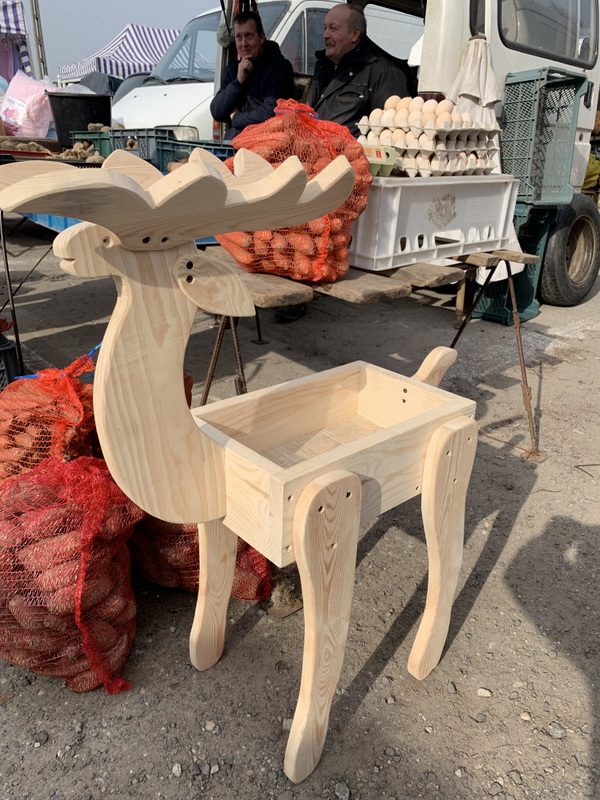 Z drewna… O, jak piękny łoś, jak żywy, do ogrodu, na kwiaty. I wóz drabiniasty, też jako dekoracja ogrodowa, 620 zł.