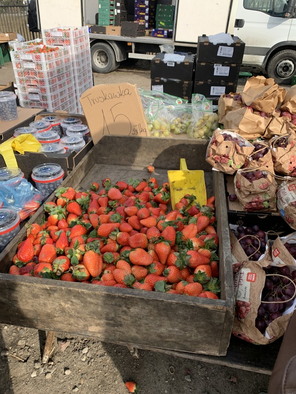 A tu jaki zapach! Jakby ktoś niezręczny rozlał perfumy, truskawkowe. Tak pachną duże i świeżutkie truskawki, jak z obrazka – 15 zł za kg. Jak smakują, nie wiem.