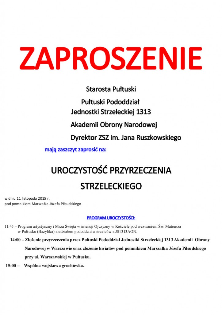 W 2014 roku podjęliśmy inicjatywę reaktywowania w powiecie pułtuskim organizacji Z.S. Strzelec O.S.W. Na bazie ochotników, tj. uczniów z klas mundurowych o profilu bezpieczeństwo narodowe z Zespołu Szkół Zawodowych im. J. Ruszkowskiego w Pułtusku, pułtuskich studentów oraz miłośników organizacji paramilitarnych został utworzony pododdział Jednostki Strzeleckiej 1313 Akademii Obrony Narodowej w Warszawie. Pułtuski pododdział po odbyciu cyklu szkoleń wojskowo-obronnych w dniu 11 listopada 2015 roku złoży uroczyste przyrzeczenie strzeleckie pod pomnikiem Marszałka Józefa Piłsudskiego – Pierwszego Komendanta Głównego Związku Strzeleckiego. W dniu 28 października br. Starosta Pułtuski zawarł porozumienie z Komendą Główną Związku Strzeleckiego Strzelec Organizacja Społeczno Wychowawcza dot. współpracy na rzecz przygotowywania młodzieży do służby w formacjach mundurowych Rzeczypospolitej Polskiej, obronności państwa i wychowania patriotycznego młodzieży ze szczególnym uwzględnieniem umacniania etosu oraz kultywowania chlubnych tradycji Wojska Polskiego, Związku Strzeleckiego Strzelec Organizacja Społeczno Wychowawcza, integracji środowiska żołnierskiego z młodzieżą. Oddział Pułtuski Związku Piłsudczyków R.P. aktywnie wspiera proces tworzenia i szkolenia pułtuskiego pododdziału strzelców z JS1313AON we współpracy z Wojskową Komendą Uzupełnień w Wyszkowie, Komendą Powiatową Policji w Pułtusku, Komendą Powiatową Państwowej Straży Pożarnej, Zespołem Szkół Zawodowych im