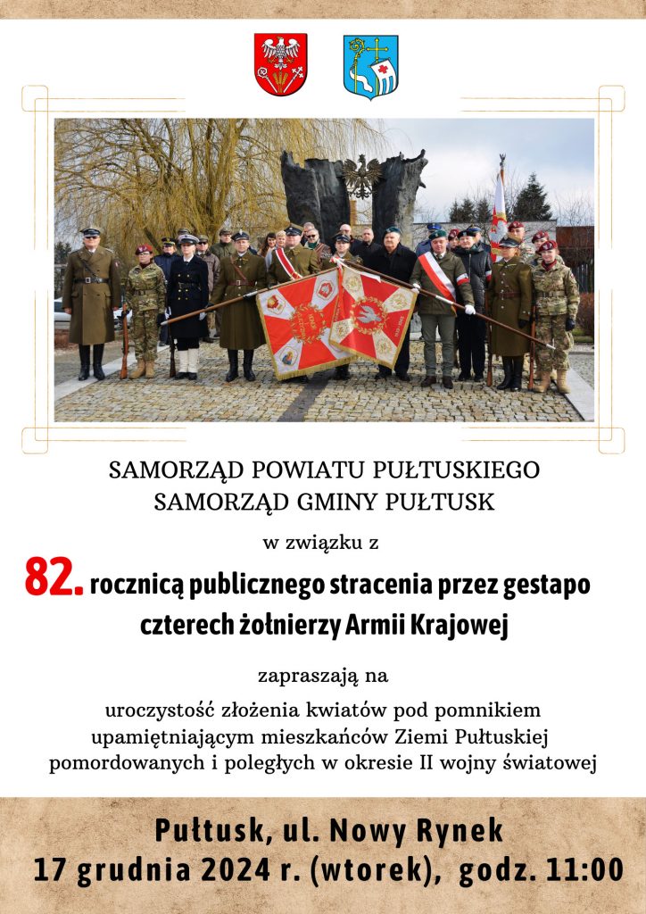 Zaproszenie na uroczystość upamiętniającą 82. rocznicę publicznego stracenia przez gestapo czterech żołnierzy Armii Krajowej edabek 10 miesięcy ago KomentarzeSee more