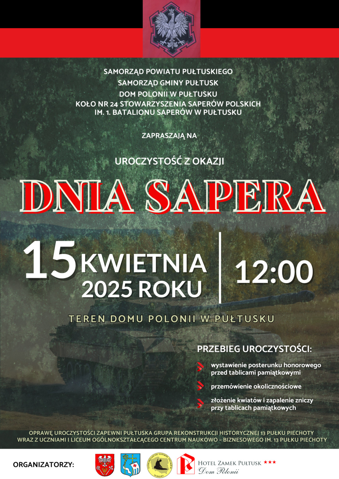 Samorząd Powiatu Pułtuskiego, Samorząd Gminy Pułtusk, Dom Polonii w Pułtusku i Koło Nr 24 Stowarzyszenia Saperów Polskich im. 1. Batalionu Saperów w Pułtusku zapraszają na uroczystość z okazji DNIA SAPERA