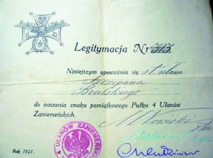 Wejdźmy teraz na wojenną ścieżkę pana Szczepana, Szczepana żołnierza, Szczepana patrioty. Relacjonuje Jadwiga: – Po zakończeniu pierwszej wojny światowej, w 1918 roku, teść został powołany do tworzącego się Wojska Polskiego w II Rzeczpospolitej. 19 czerwca 1918 roku ojciec odwiózł go na stację w Gąsocinie, skąd syn udał się do Ciechanowa, miejsca żołnierskiej zbiórki. Po trzech dniach wyruszyli do Białegostoku. Został przydzielony do Pułku 4 Ułanów Zaniemeńskich, stacjonującego w Białymstoku. Tu odbywały się pierwsze musztry, ćwiczenia. Każdy z ułanów zgłosił się do wojska z własnym koniem i rzędem końskim, to znaczy siodłem, czaprakiem, ostrogami. Te właśnie ostrogi zachowały się do dzisiaj. Zachowały się też zdjęcia i dokumenty – Jadwiga wskazuje na sepiowe kartki z pięknym kaligraficznym pismem. Kontynuuje: – Kiedy w 1920 roku armia rosyjska pod dowództwem marszałka Michaiła Tuchaczewskiego napadła na powstałe niedawno państwo polskie, teść walczył na froncie litewsko-białoruskim pod dowództwem generała POLSKI ODRODZONEJ Stanisława Szeptyckiego. Walczył pod Baranowiczami oraz nad rzeką Dźwiną i Berezyną. Berezynę wojsko przekraczało wpław. Ułani zsiadali z koni i trzymając się końskiej grzywy płynęli. W pewnej chwili, jak wiemy z przekazów rodzinnych, koń Szczepana dostał się w ogromny wir rzeczny i wespół znaleźli się pod wodą. Tonący stracił już nadzieję na uratowanie życia, ale koń w ostatniej chwili odbił się od dna i niemal z rykiem wydostał się z kipieli, ciągnąc z sobą jeźdźca. Tak zostali uratowani, a wielu żołnierzy zginęło…