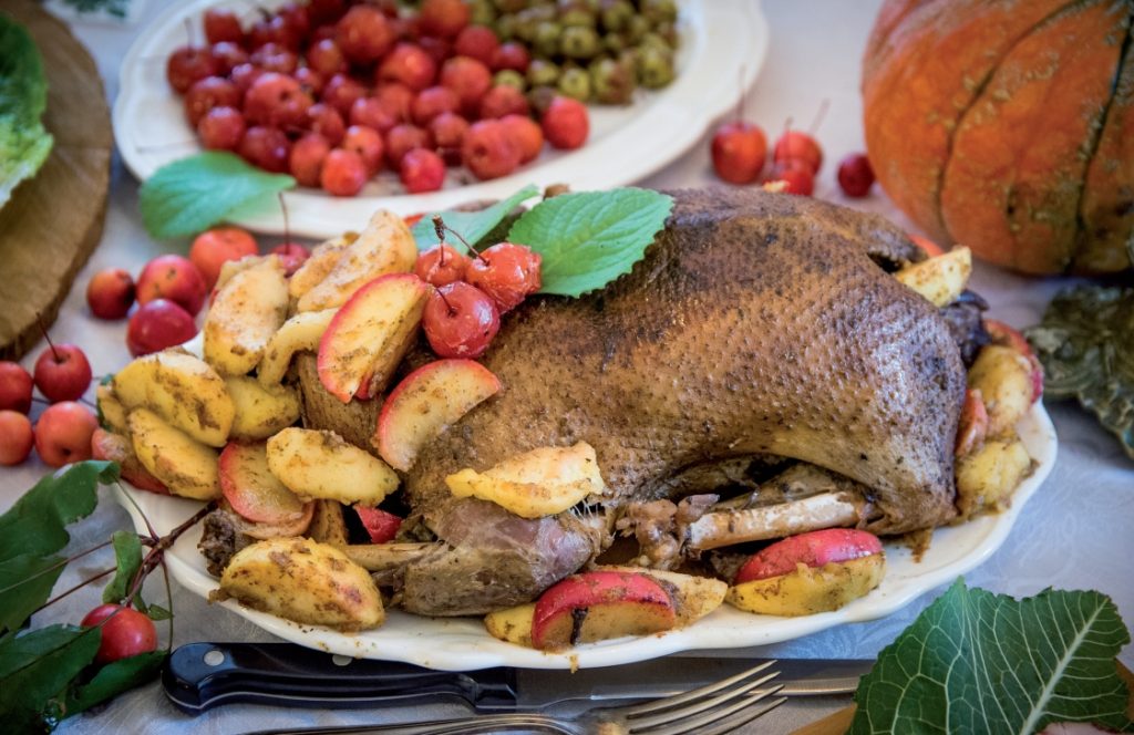 Tuszka kaczki, 10 dag klarowanego masła, 1/2 kg jabłek Reneta, 10 dag żurawiny do mięsa, białe wino półwytrawne, sól kłodawska, pół płaskiej łyżeczki pieprzu, 1/2 łyżeczki cynamonu, majeranek, 2 posiekane ząbki czosnku. Jabłka do pieczenia, tyle sztuk, ilu będzie biesiadników, ja przewidziałam czworo. Folia do pieczenia mięsa.