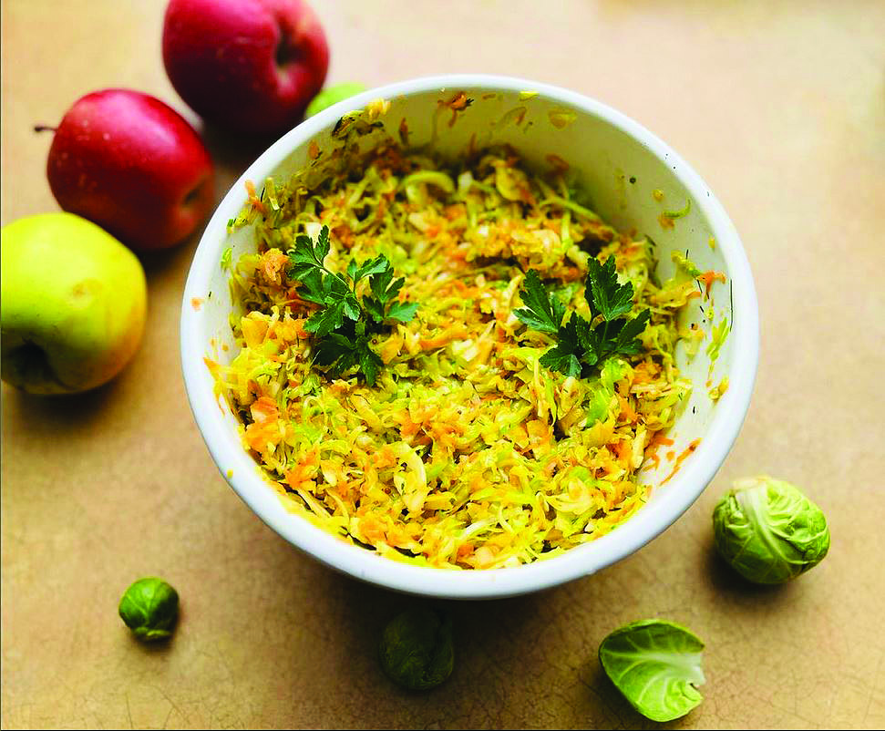 Wyczyszczoną brukselkę przekrawamy na pół i kroimy w jak najcieńsze paski. Można też zetrzeć na paski na tarce. Pora kroimy w piórka. Obraną marchewkę i jabłko ścieramy na drobnych oczkach.