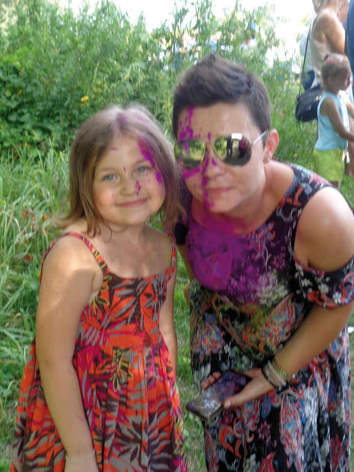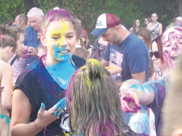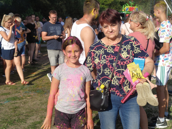 Masowe kolorowanie przywiodło nad Narew tłumy pułtuszczan (dzieci z rodzicami i babciami oraz młodzież) i sporo przyjezdnych. Kto chciał się kolorować, musiał nabyć torebkę dowolnego koloru farbki za 15 złotych. Chętnych było dużo, toteż było naprawdę barwnie i wesoło. I głośno – grała muzyka. Rozbawione dziewczęta chętnie pozowały do zdjęć dla TYGODNIKA. Tak sfotografowaliśmy Olę, Ewelinę, Karolinę, Magdę, Jowitę i Julkę. Potem Amelię, Natalię, Maję i Zosię.