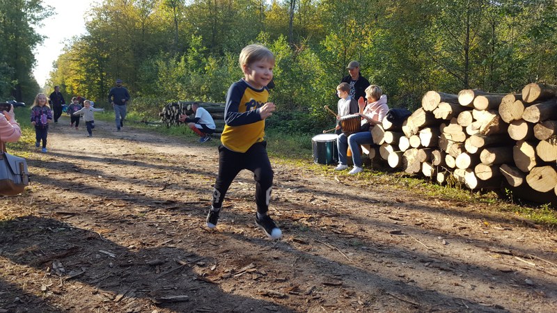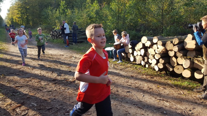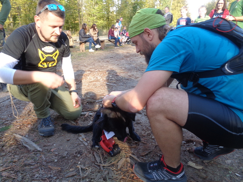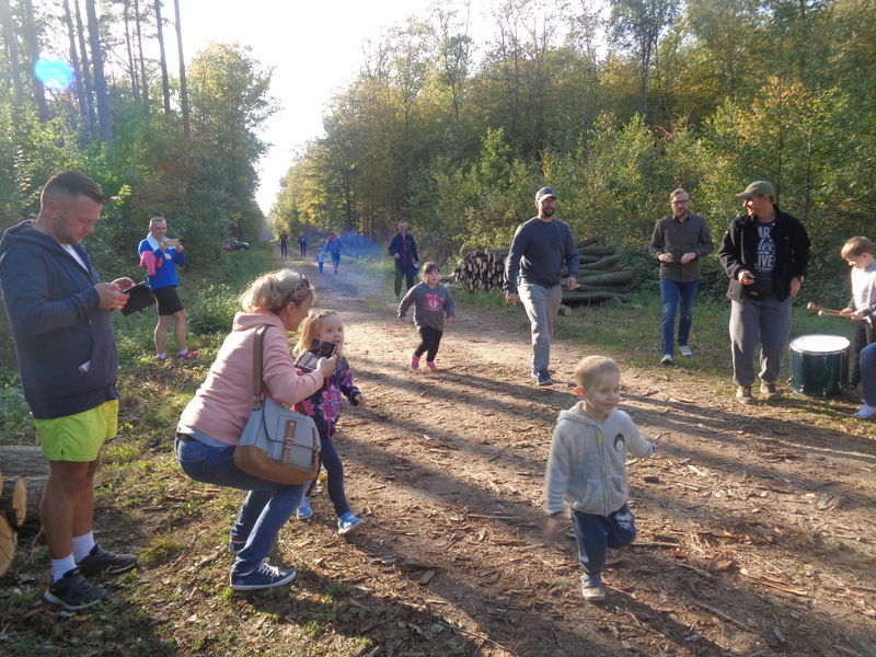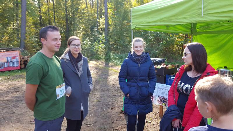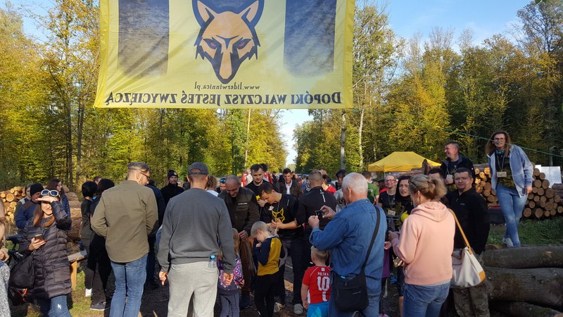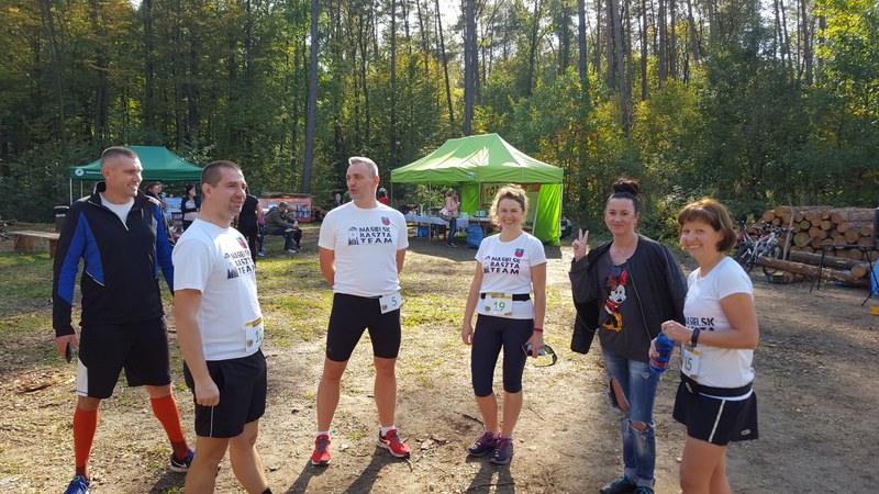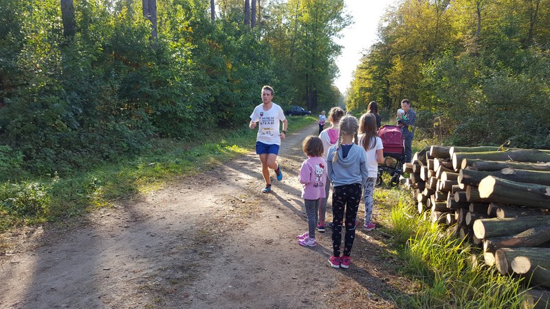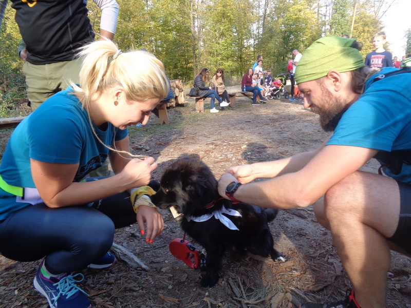 Wśród biorących udział w leśnych biegach spotykam warszawiaków – Justynę Czyż i Mateusza Trzcińskiego, którzy do Łachonia przyjechali z pieskiem Yogi, znajdką. – To jego pierwszy oficjalny bieg, a mój trzeci, biegłam w zeszłym roku, latem tego roku, w czerwcu, i biorę udział w dzisiejszym – mówi pani Justyna. – Staramy się brać udział w takich małych, kameralnych biegach, gdzie ludzie się znają, gdzie jest zupełnie inna atmosfera niż na kilkutysięcznych biegach. Tu wszyscy są uśmiechnięci, mili, dobrze się bawią. My też przyszliśmy się tu bawić – podaje pan Mateusz.