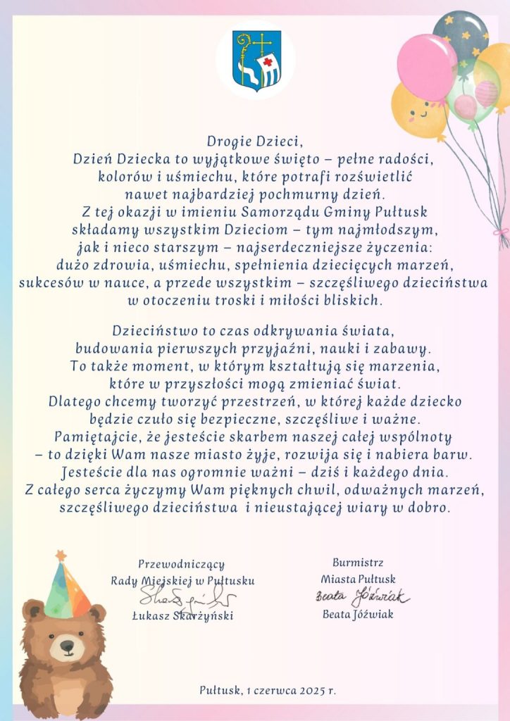 Z tej okazji w imieniu Samorządu Gminy Pułtusk składamy wszystkim Dzieciom – tym najmłodszym,